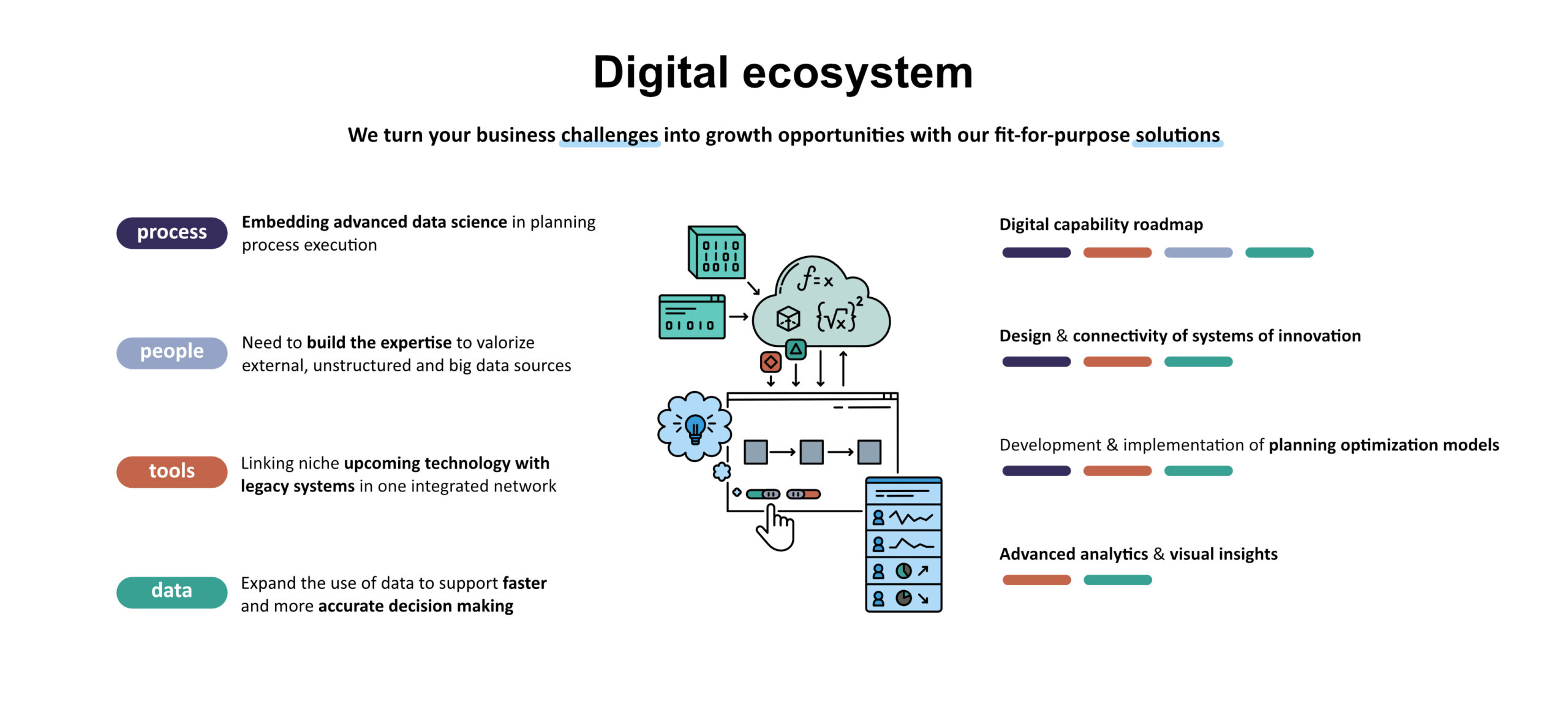 We assess your digital supply chain planning capabilities and create a feasible and ready to execute roadmap plan. We provide you tangible building blocks for growth, taking into consideration organizational structure, processes, data, and tools.