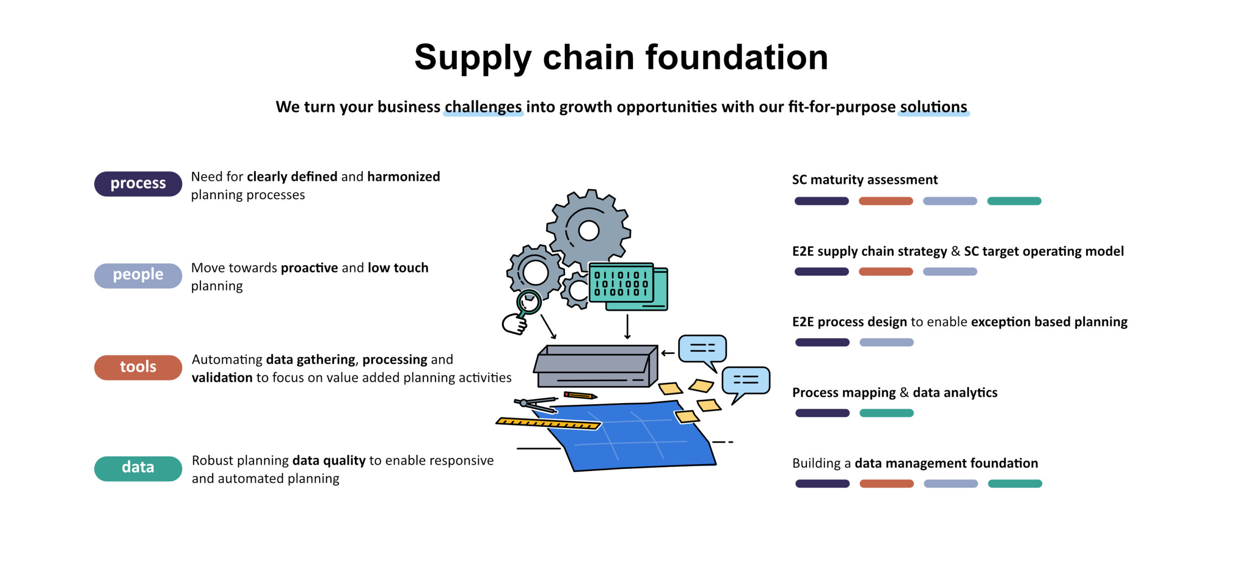 We help you assess your current supply chain on the level of organizational structure, process, data and tools.